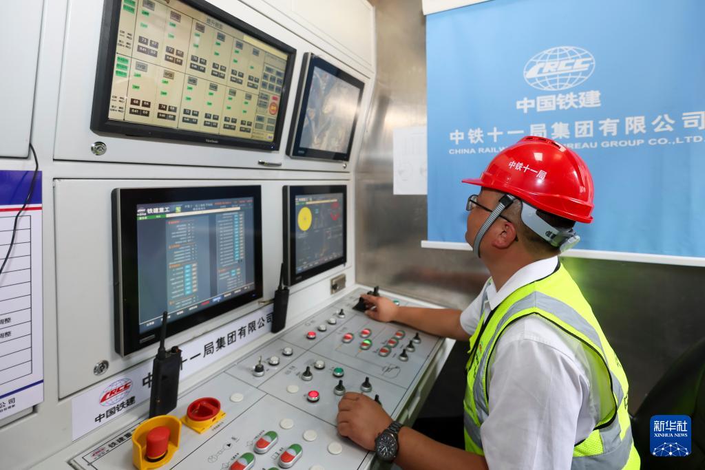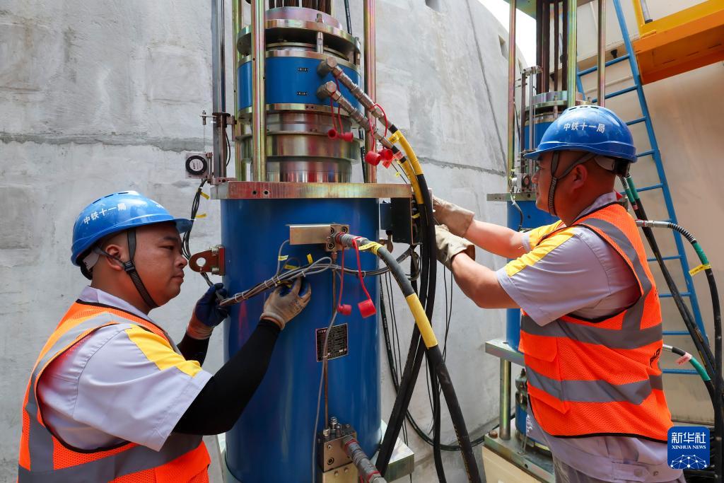 6月18日,作業(yè)人員在調(diào)試豎井掘進(jìn)機(jī)配套設(shè)施。
