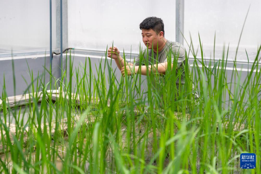 6月18日,在中國水稻研究所北方水稻研究中心的玻璃溫室中,科研人員查看雜交水稻親本的長勢。