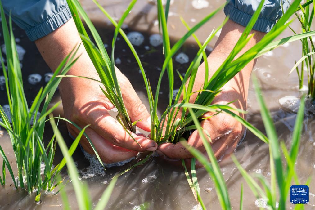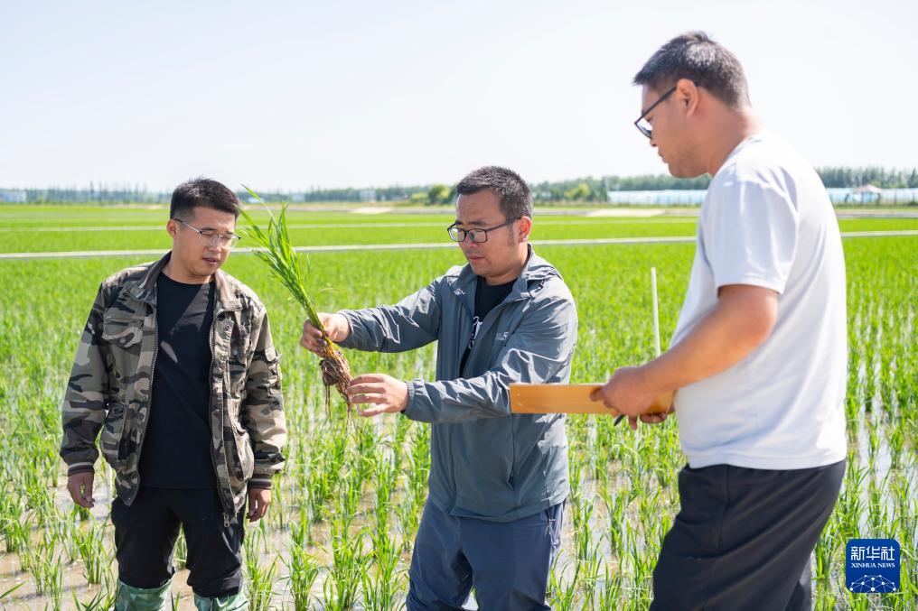 6月18日,在中國水稻研究所北方水稻研究中心,科研人員查看不同品種水稻的長勢。