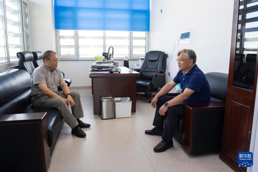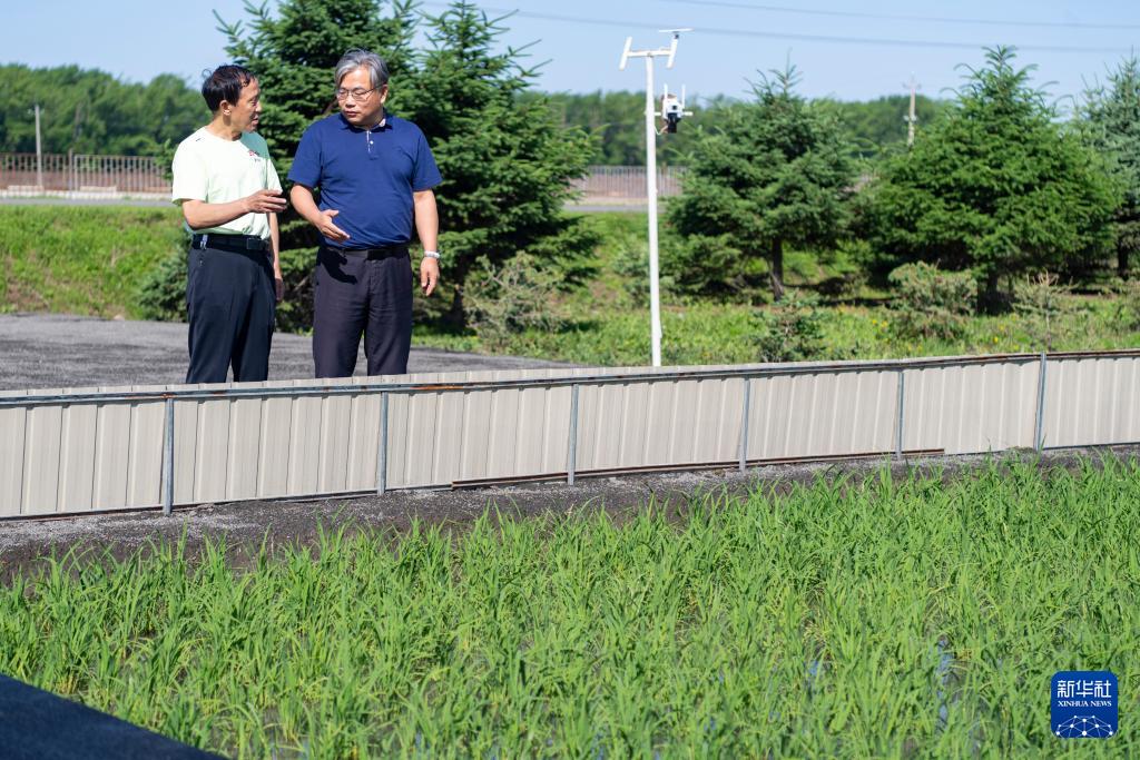 6月18日,在中國水稻研究所北方水稻研究中心,中心主任曹立勇(右)與浙江大學農(nóng)業(yè)與生物技術(shù)學院教授徐海明交流寒地粳稻智能育種方面的合作。