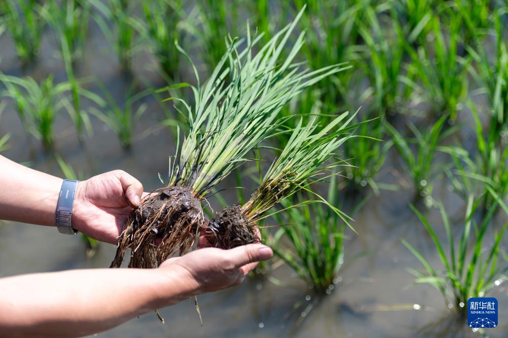 6月18日,在中國水稻研究所北方水稻研究中心的試驗田內(nèi),科研人員查看水稻根系生長情況。