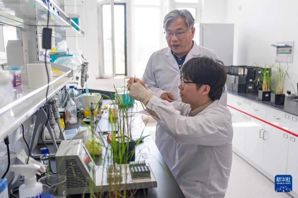 6月18日,在中國水稻研究所北方水稻研究中心,中心主任、研究員曹立勇(后)指導科研人員測試水稻對不同化合物的反應(yīng)。