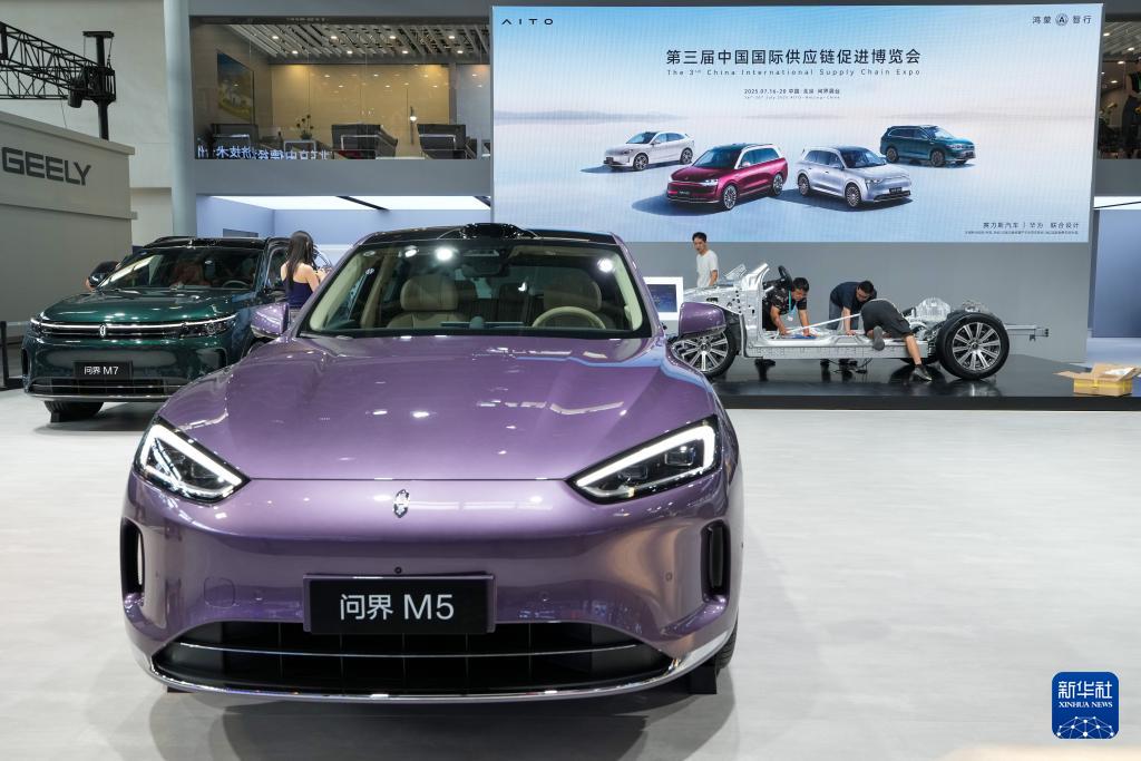 7月14日在第三屆中國國際供應(yīng)鏈促進(jìn)博覽會智能汽車鏈展區(qū)拍攝的問界展位。
