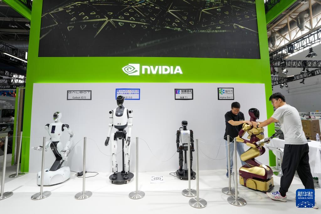 7月14日,在第三屆中國國際供應(yīng)鏈促進(jìn)博覽會數(shù)字科技鏈展區(qū)英偉達(dá)公司展位,工作人員在布置展品。