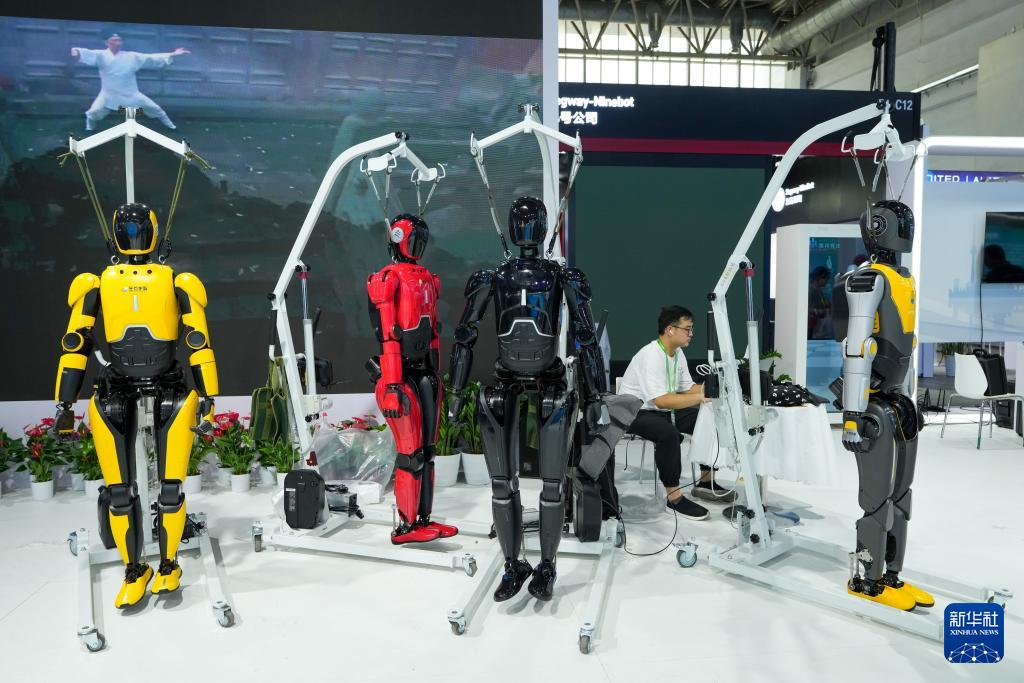 7月14日,在第三屆中國國際供應(yīng)鏈促進(jìn)博覽會數(shù)字科技鏈展區(qū)的“湖北人形機(jī)器人產(chǎn)業(yè)鏈專題展區(qū)”,工作人員在布置展品。