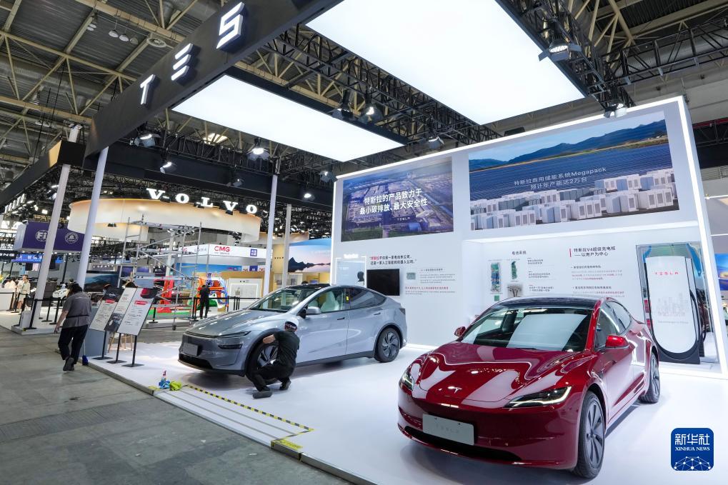 7月14日在第三屆中國國際供應(yīng)鏈促進(jìn)博覽會智能汽車鏈展區(qū)拍攝的特斯拉展位。