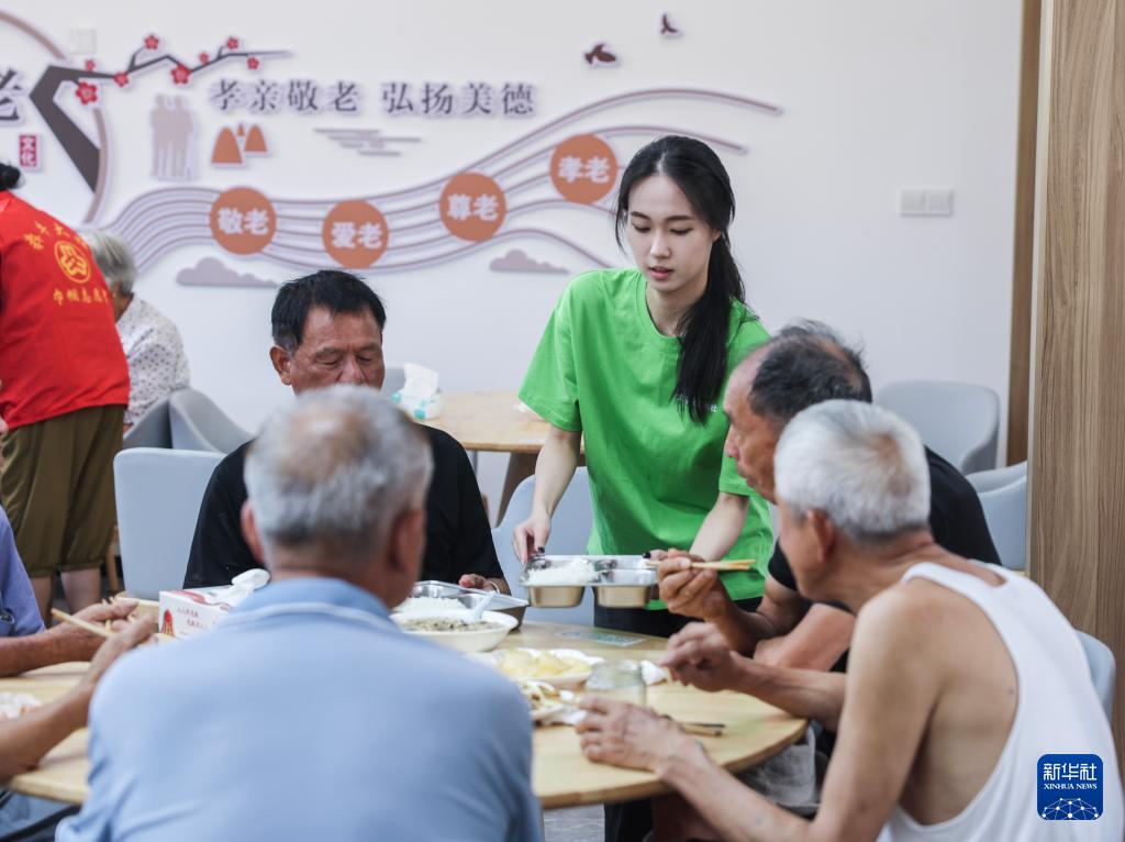 7月15日,在諸暨市安華鎮(zhèn)豐江周村愛心食堂,浙江農(nóng)林大學(xué)暨陽學(xué)院的學(xué)生開展助餐志愿服務(wù)。