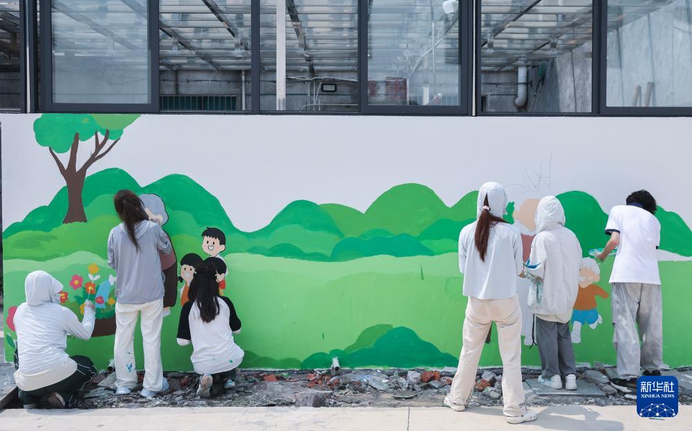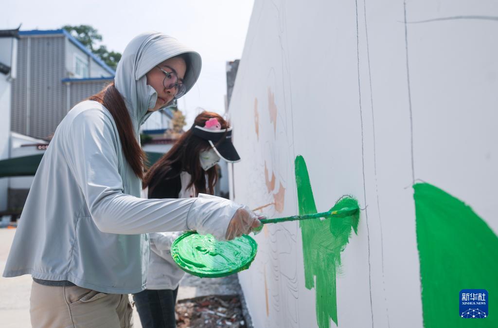 7月15日,在諸暨市安華鎮(zhèn)豐江周村,浙江農(nóng)林大學(xué)暨陽學(xué)院設(shè)計(jì)專業(yè)的學(xué)生們創(chuàng)作墻繪,美化鄉(xiāng)村人居環(huán)境。