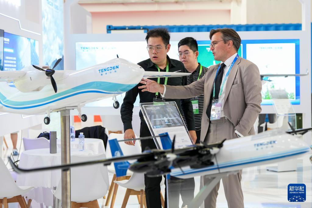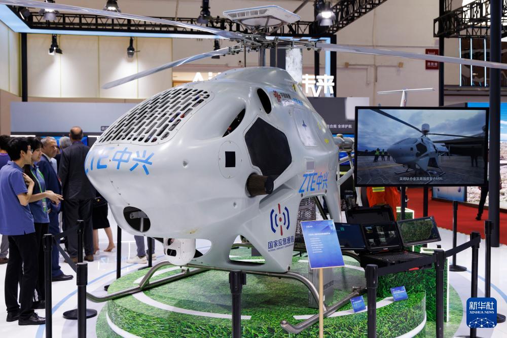 7月16日在數(shù)字科技鏈展區(qū)拍攝的大型無(wú)人直升機(jī)應(yīng)急救援平臺(tái)。