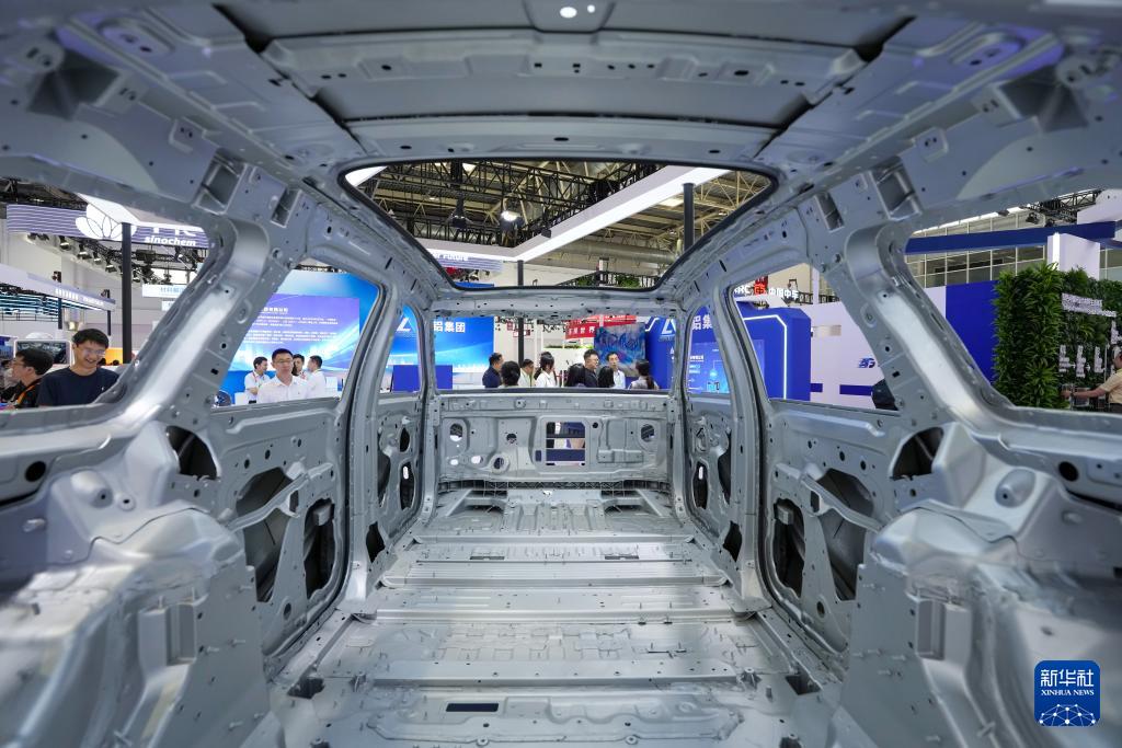 7月16日,人們?cè)谙冗M(jìn)制造鏈展區(qū)中鋁集團(tuán)展臺(tái)參觀展出的鋁制新能源汽車(chē)白車(chē)身。