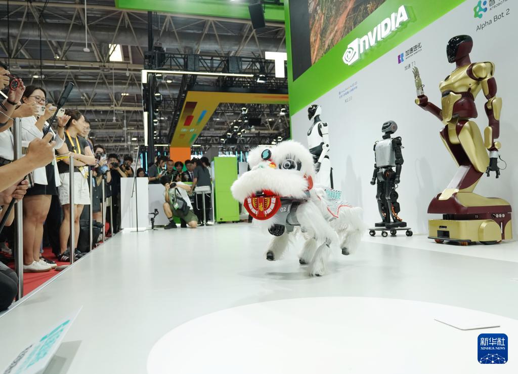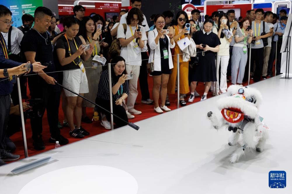 7月16日,觀眾在數(shù)字科技鏈展區(qū)參觀一款“機(jī)器獅子”表演。