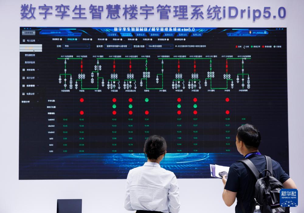 7月16日在清潔能源鏈展區(qū)拍攝的數(shù)字孿生智慧樓宇管理系統(tǒng)。