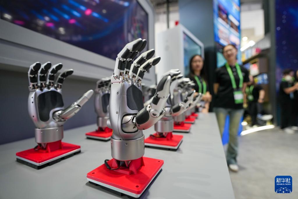 7月16日在先進(jìn)制造鏈展區(qū)中信集團(tuán)展臺(tái)拍攝的機(jī)器手。