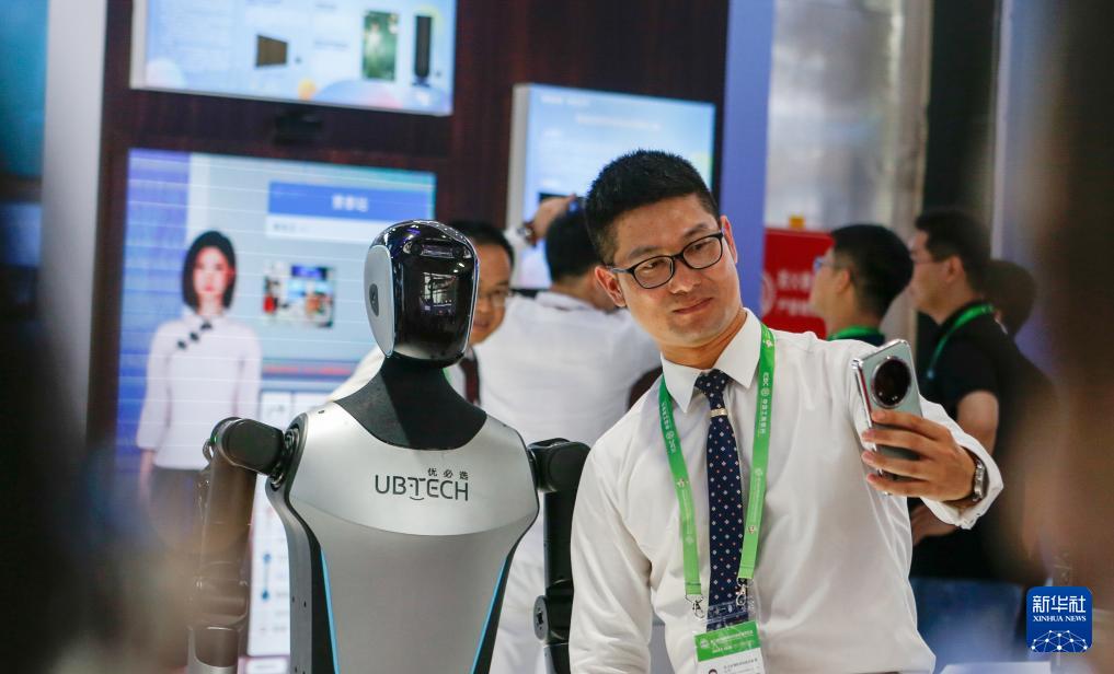 7月16日,參會(huì)者在智能汽車(chē)鏈展區(qū)與優(yōu)必選人形機(jī)器人合影。