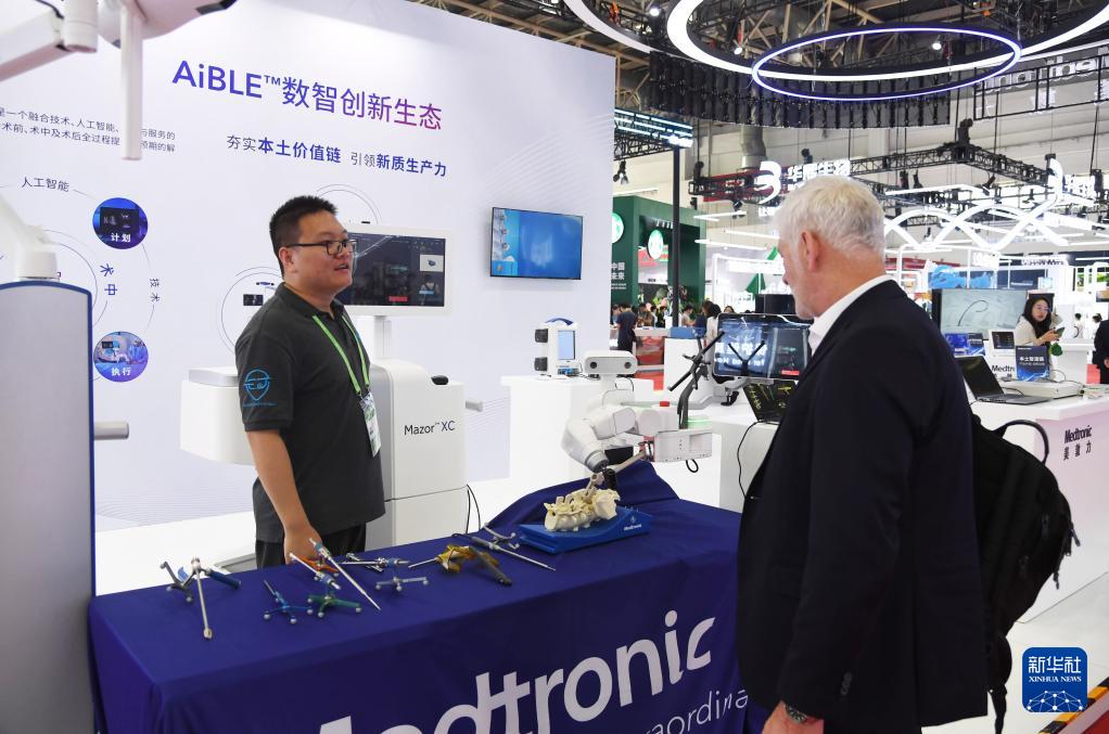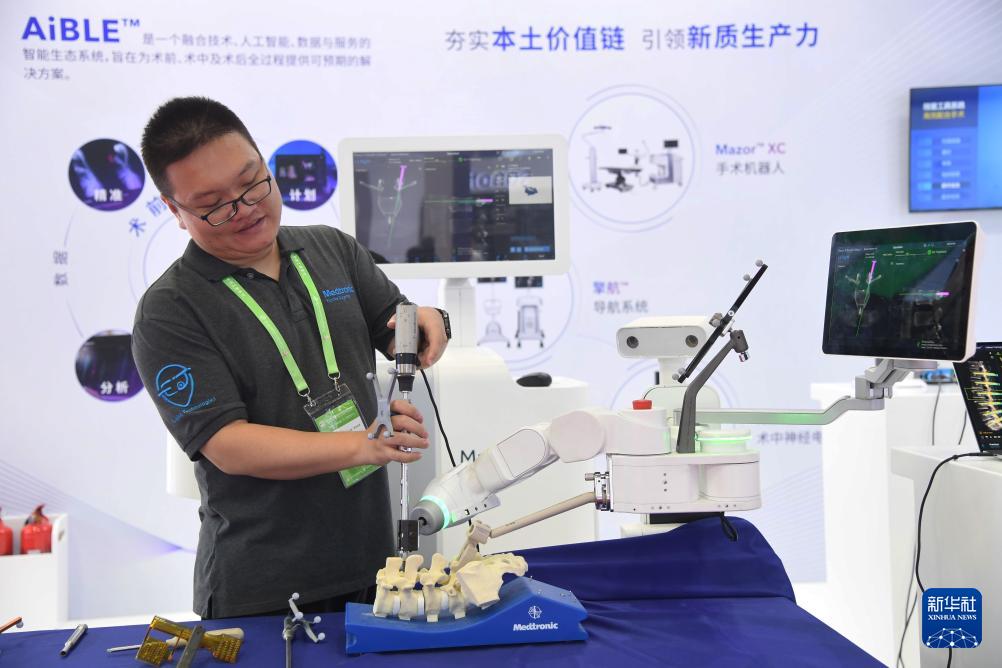 7月16日,工作人員(左)在健康生活鏈展區(qū)為觀眾介紹一款骨科手術(shù)機(jī)器人。