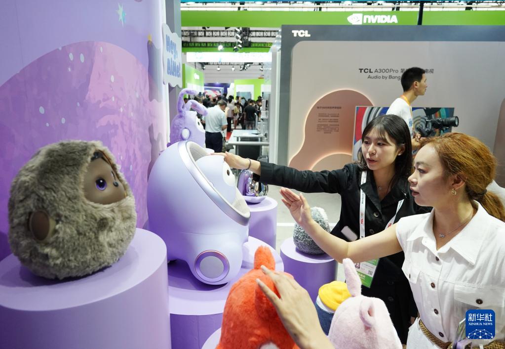 7月16日,觀眾們?cè)跀?shù)字科技鏈展區(qū)了解分體式陪伴機(jī)器人。