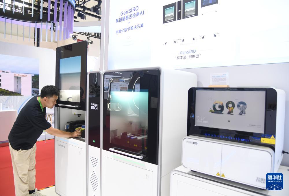 7月16日在健康生活鏈展區(qū)華大集團(tuán)展位拍攝的高通量基因檢測(cè)AI+本地化醫(yī)學(xué)解決方案。