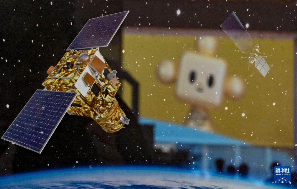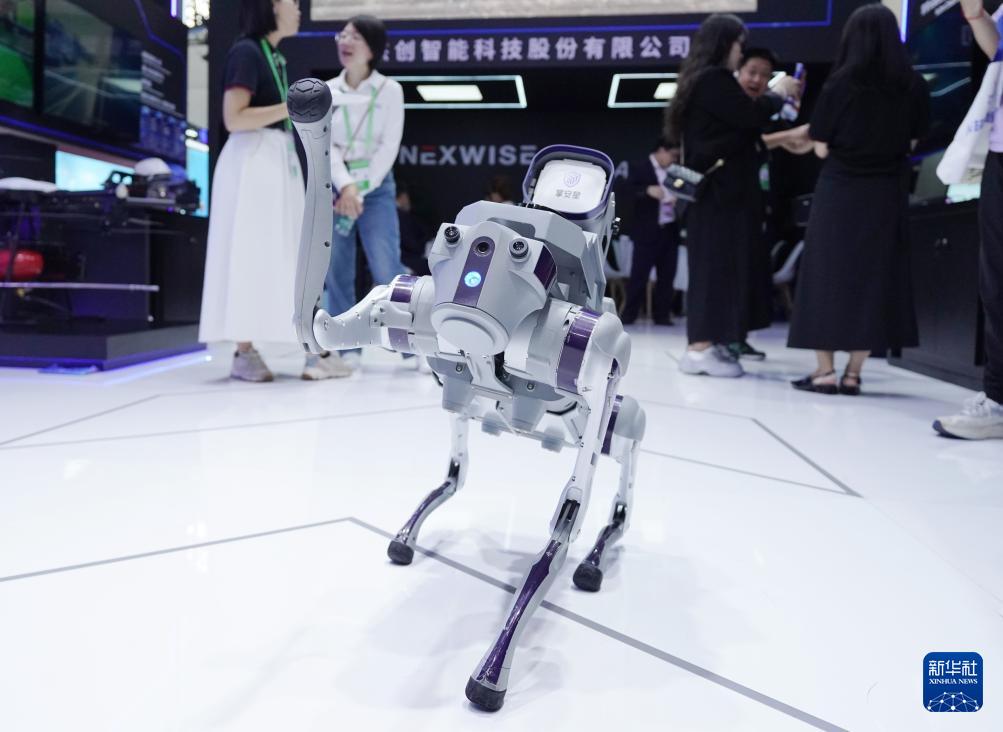 這是7月16日在數(shù)字科技鏈展區(qū)拍攝的電磁網(wǎng)捕巡防機(jī)器狗。