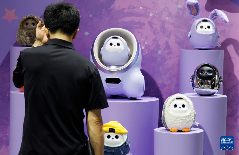 7月16日在數(shù)字科技鏈展區(qū)拍攝的分體式陪伴機(jī)器人。