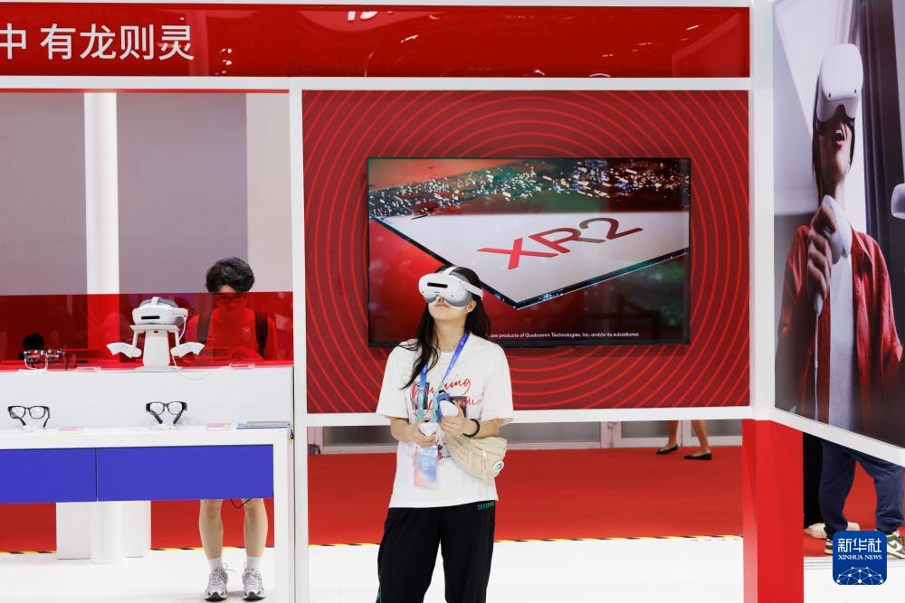 7月16日,一名參觀者在數(shù)字科技鏈展區(qū)體驗(yàn)虛擬現(xiàn)實(shí)游戲。