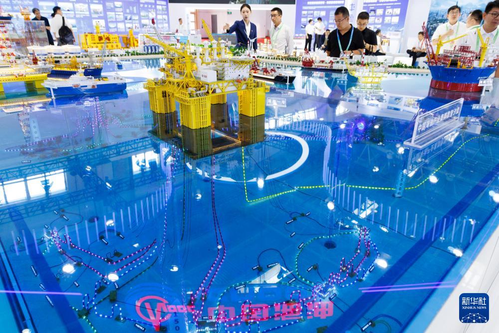 7月16日在清潔能源鏈展區(qū)拍攝的中國(guó)海油產(chǎn)業(yè)集群數(shù)智沙盤(pán)。