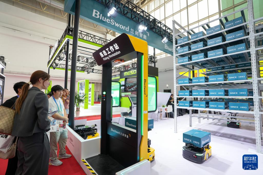 7月16日,參觀者在先進(jìn)制造鏈展區(qū)蘭劍智能展臺(tái)了解“蜘蛛俠懸掛式料箱機(jī)器人系統(tǒng)”。
