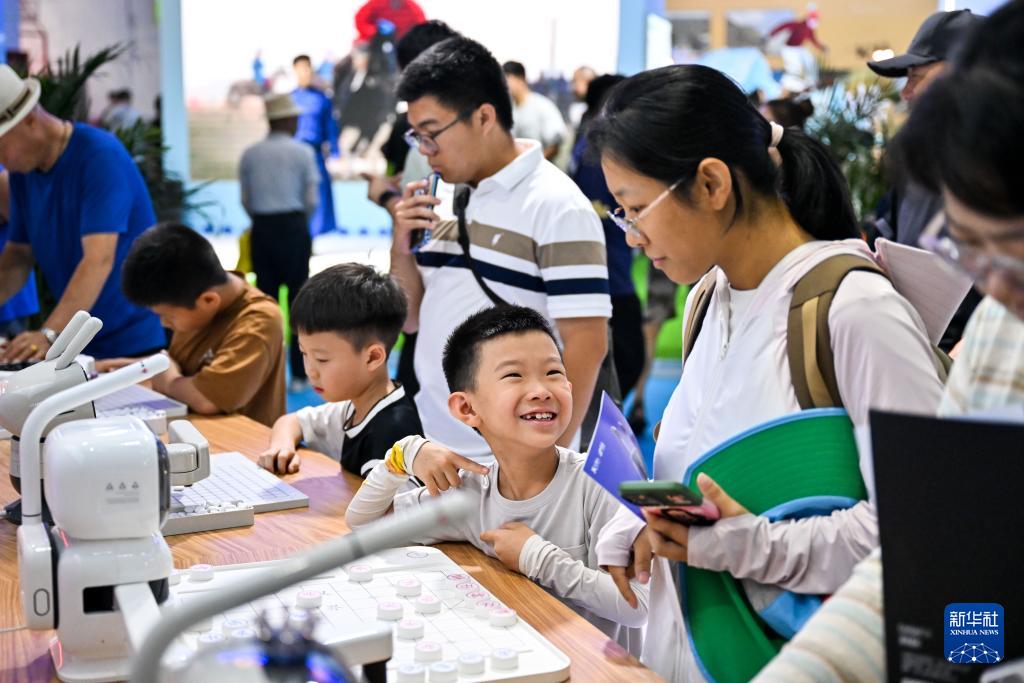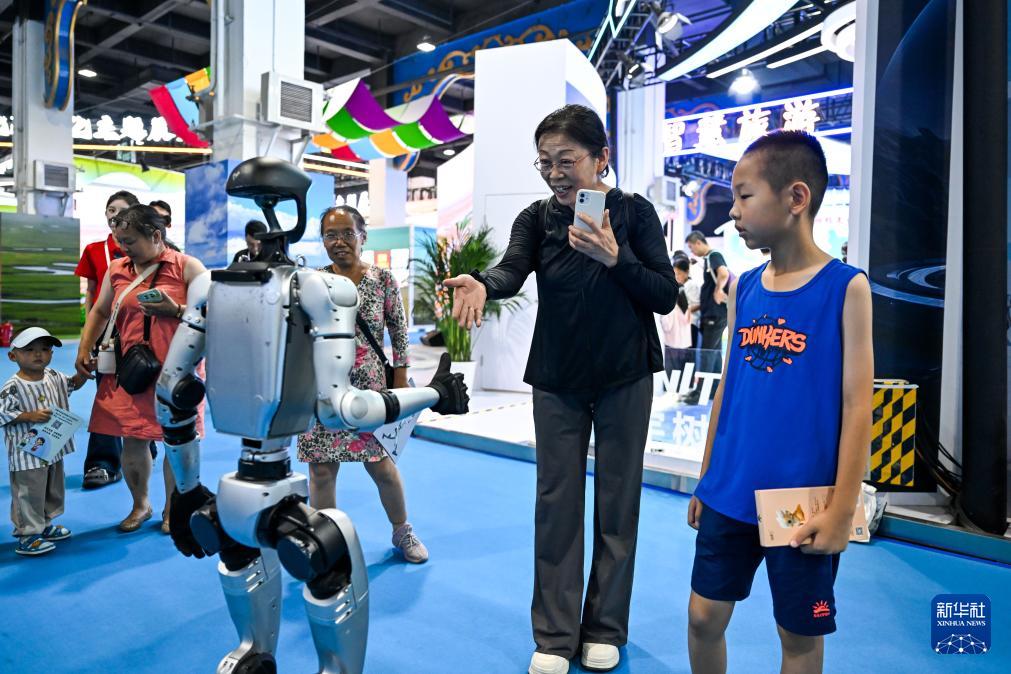 7月17日,觀眾在第九屆內(nèi)蒙古自治區(qū)文化產(chǎn)業(yè)博覽交易會(huì)現(xiàn)場(chǎng)與機(jī)器人互動(dòng)。