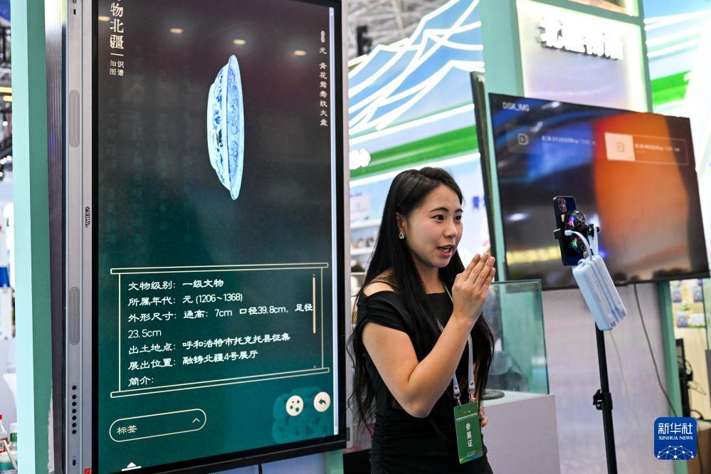 7月17日,一名主播在第九屆內(nèi)蒙古自治區(qū)文化產(chǎn)業(yè)博覽交易會(huì)現(xiàn)場(chǎng)介紹文物信息。