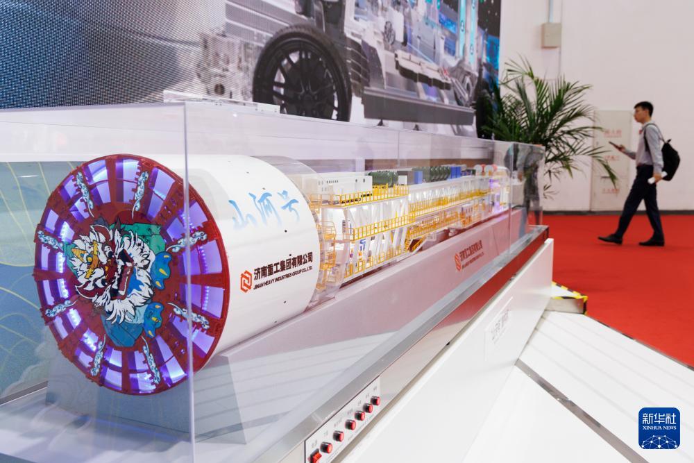 7月17日在第三屆中國(guó)國(guó)際供應(yīng)鏈促進(jìn)博覽會(huì)主賓省山東省展臺(tái)拍攝的“山河號(hào)”盾構(gòu)機(jī)。