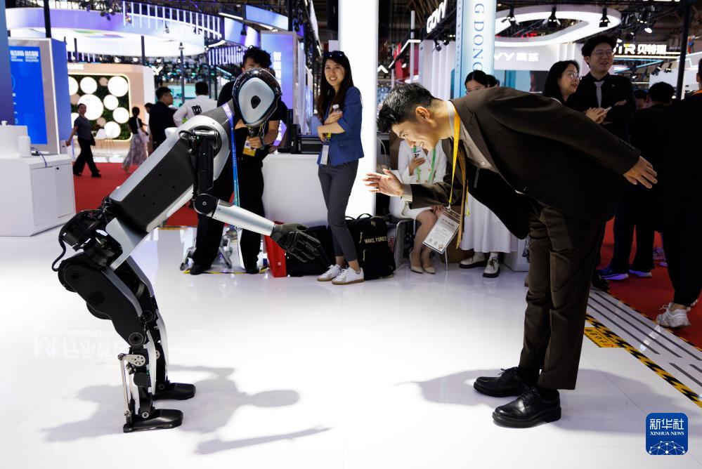 7月17日,在第三屆中國(guó)國(guó)際供應(yīng)鏈促進(jìn)博覽會(huì)主賓省廣東省展臺(tái),商用版人形機(jī)器人“行者”和一位媒體記者互致問(wèn)候。