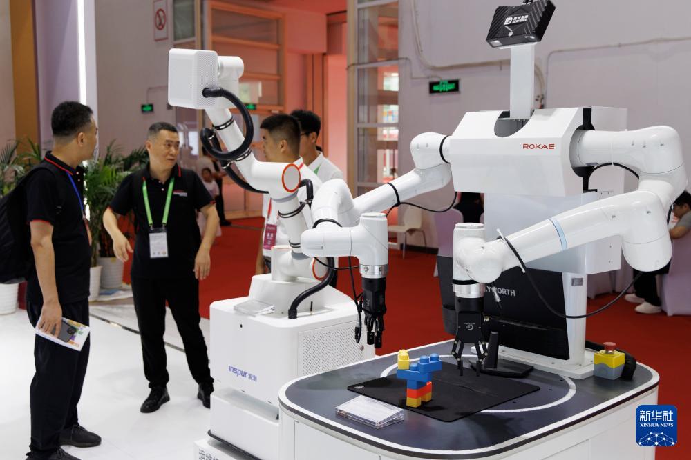 7月16日在第三屆中國(guó)國(guó)際供應(yīng)鏈促進(jìn)博覽會(huì)主賓省山東省展臺(tái)拍攝的具身智能雙臂機(jī)器人。