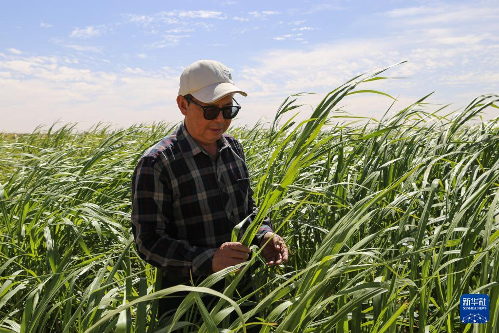 1月18日,在毛里塔尼亞伊迪尼村,中國援毛里塔尼亞畜牧業(yè)技術(shù)示范中心主任張洪恩在菌草田查看菌草生長情況。