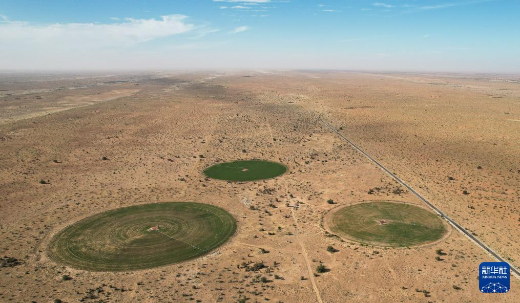 這是1月18日在毛里塔尼亞伊迪尼村中國援毛里塔尼亞畜牧業(yè)技術(shù)示范中心拍攝的三處紫花苜蓿田(無人機(jī)照片)。