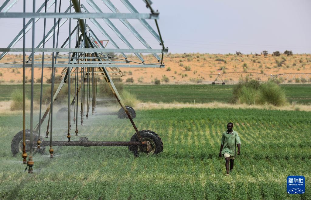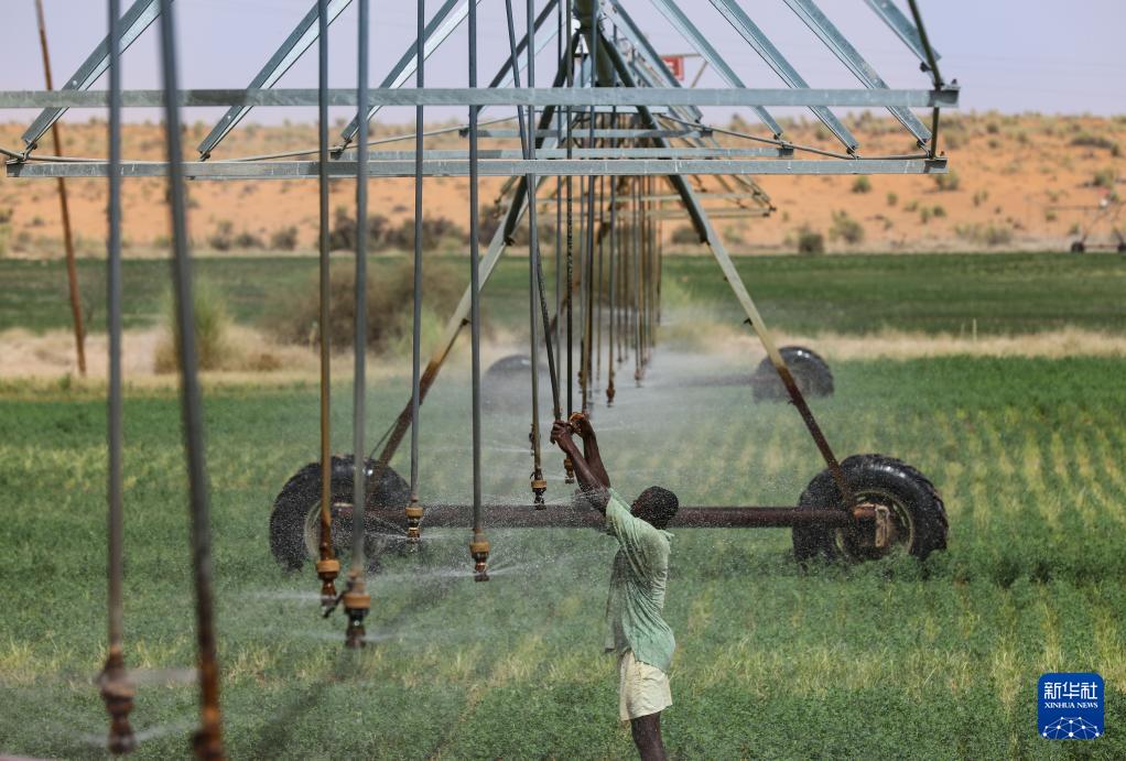 7月18日,在毛里塔尼亞伊迪尼村,牧民在中國援毛里塔尼亞畜牧業(yè)技術(shù)示范中心的紫花苜蓿田檢查噴灌設(shè)備的運(yùn)行情況。