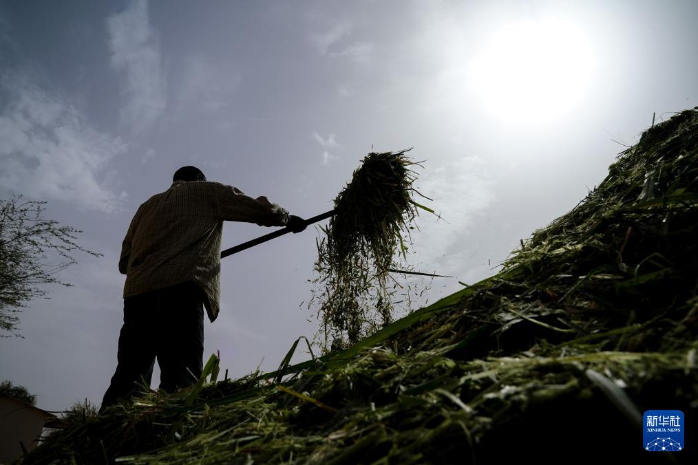 7月18日,在毛里塔尼亞伊迪尼村,牧民在中國援毛里塔尼亞畜牧業(yè)技術(shù)示范中心處理菌草。
