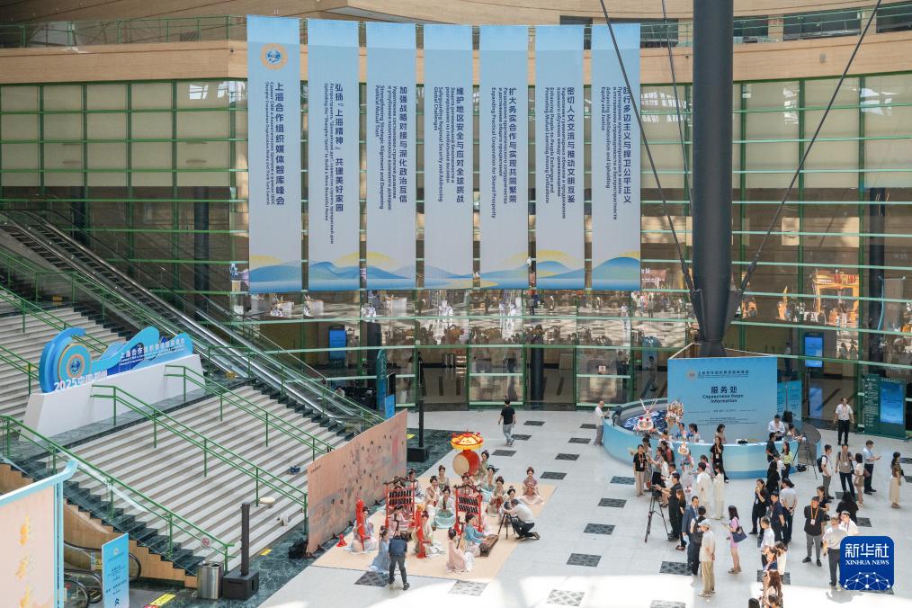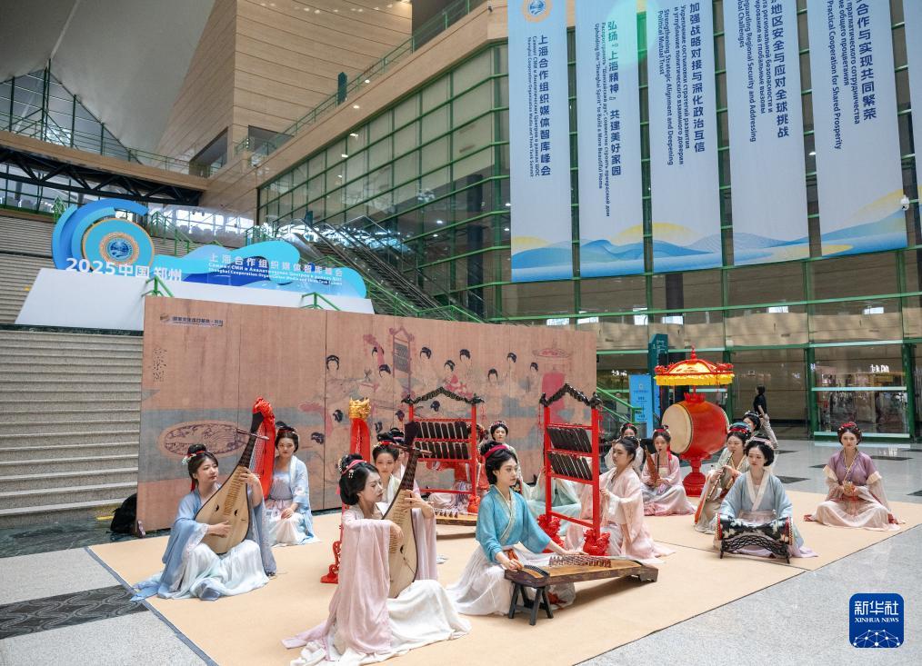 這是在上海合作組織媒體智庫(kù)峰會(huì)會(huì)場(chǎng)進(jìn)行的《合樂圖》民族樂器復(fù)刻展演(7月24日攝)。