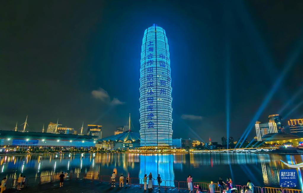 7月23日晚,鄭州國(guó)際會(huì)展中心旁的千璽廣場(chǎng)主樓亮燈宣傳上海合作組織媒體智庫(kù)峰會(huì)。鄭州國(guó)際會(huì)展中心是峰會(huì)舉辦地。