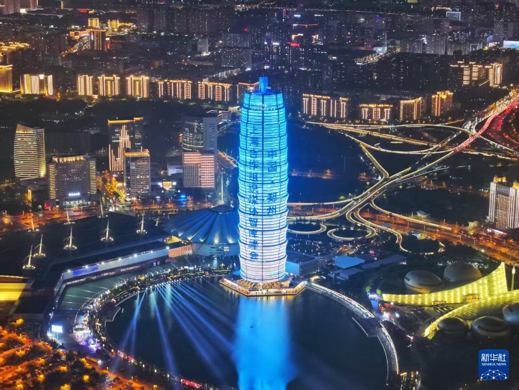 7月23日晚,鄭州國(guó)際會(huì)展中心旁的千璽廣場(chǎng)主樓亮燈宣傳上海合作組織媒體智庫(kù)峰會(huì)(無(wú)人機(jī)照片)。鄭州國(guó)際會(huì)展中心是峰會(huì)舉辦地。