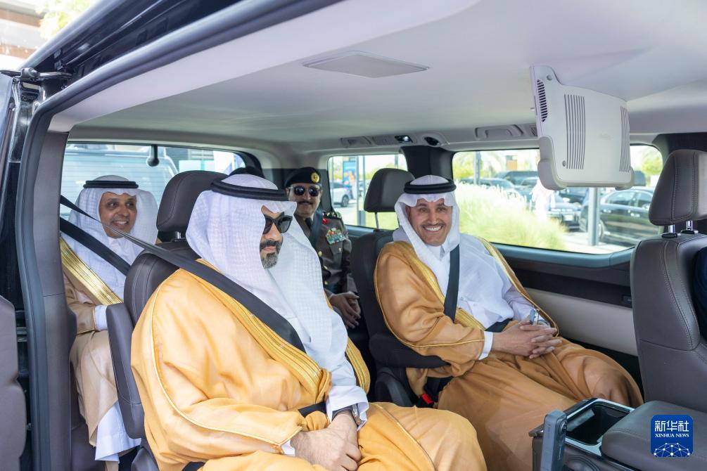 7月23日,在沙特阿拉伯首都利雅得,沙特交通和物流服務(wù)大臣薩利赫·賈西爾(右一)體驗文遠知行旗下的無人駕駛出租車。