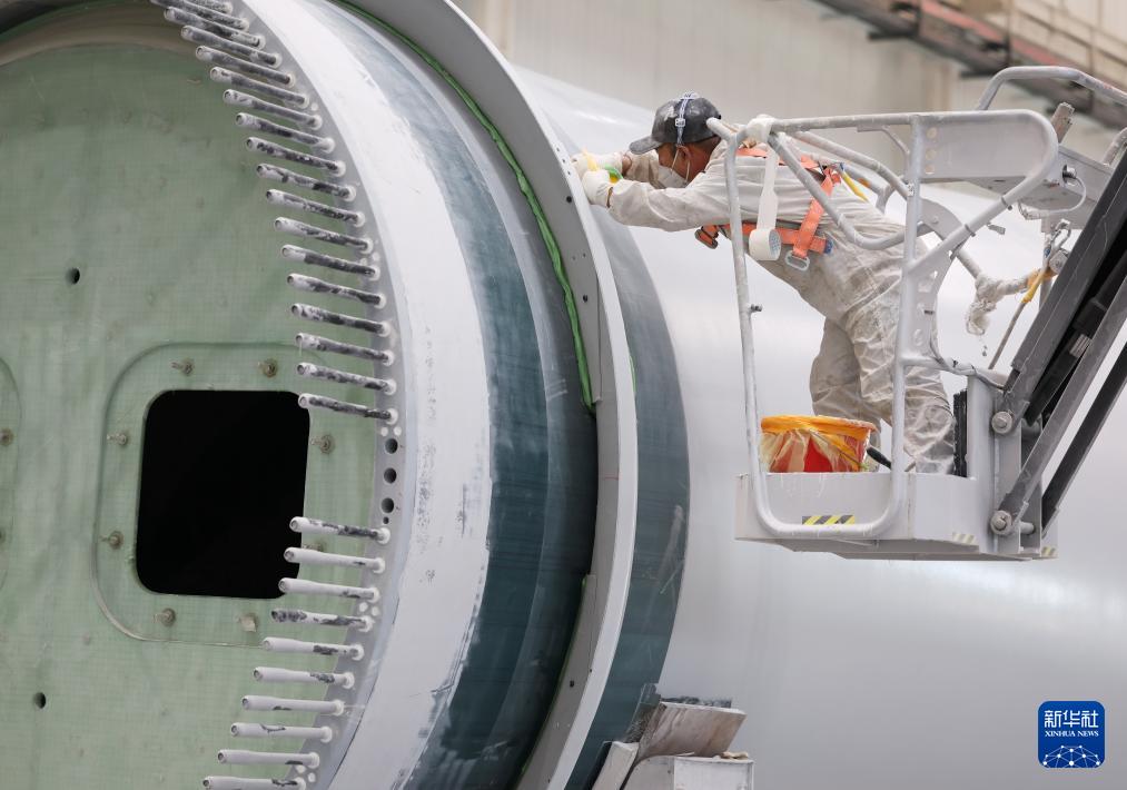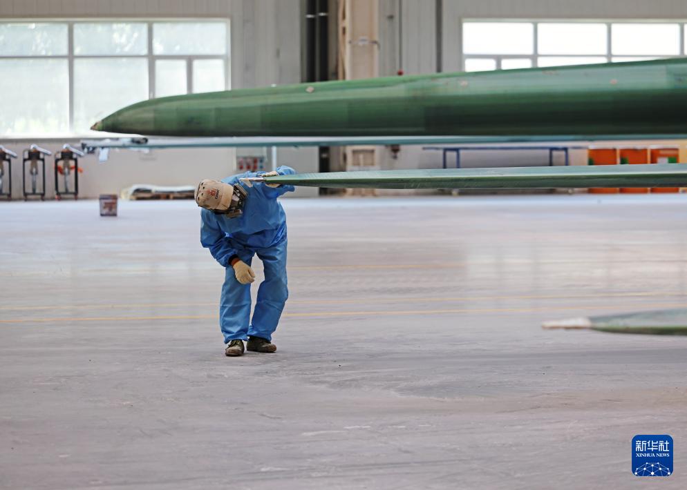 7月30日,在鐵嶺明陽新能源有限公司車間,工人在加工風(fēng)力發(fā)電機(jī)葉片。