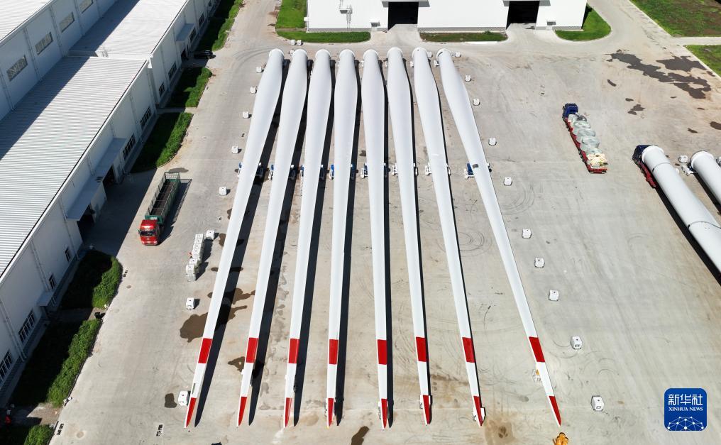 7月30日在鐵嶺明陽新能源有限公司拍攝的風(fēng)力發(fā)電機(jī)葉片(無人機(jī)照片)。