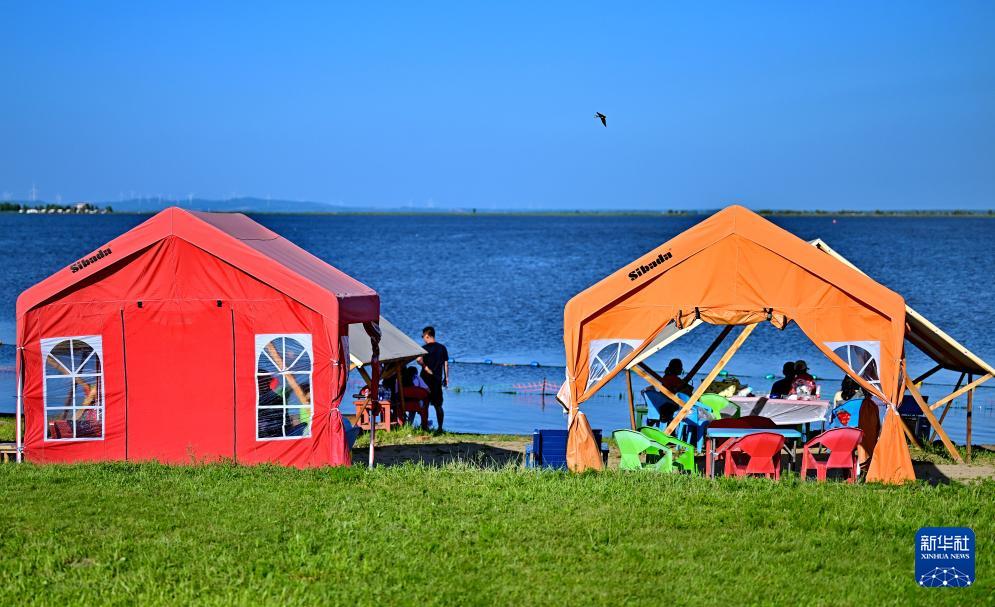 人們在哈爾濱市松花江畔的帳篷中消暑休閑(7月6日攝,無人機(jī)照片)。
