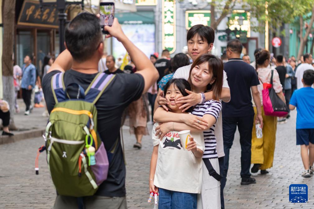 人們在哈爾濱中華巴洛克歷史文化街區(qū)游覽(7月30日攝)。