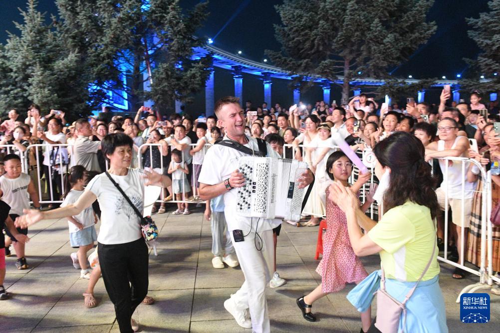 7月22日,在哈爾濱市防洪紀(jì)念塔廣場,游客與來自俄羅斯的手風(fēng)琴手互動(dòng)。