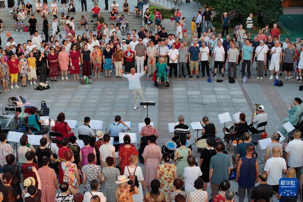 7月25日,在哈爾濱市松花江畔,民間合唱團(tuán)的演唱吸引人們駐欣賞(無人機(jī)照片)。