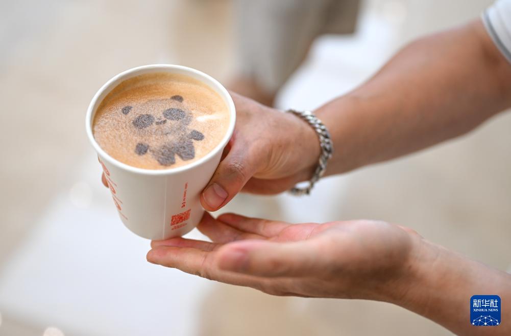 8月4日,一名媒體記者在成都世運(yùn)會主媒體中心展示由咖啡機(jī)器人制作的帶有吉祥物“蜀寶”圖案的飲品。