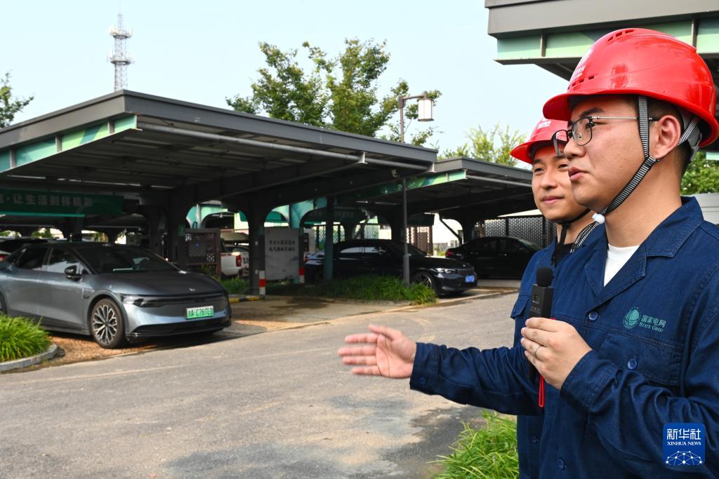 8月4日,在浙江省杭州市蕭山區(qū)梅林村,技術(shù)人員介紹光充儲(chǔ)一體化充電站。