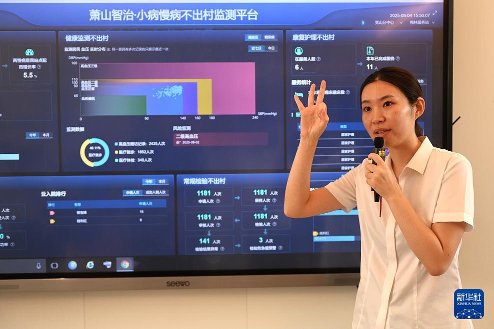 8月4日,在浙江省杭州市蕭山區(qū)梅林村,工作人員介紹智慧健康監(jiān)測(cè)平臺(tái)。