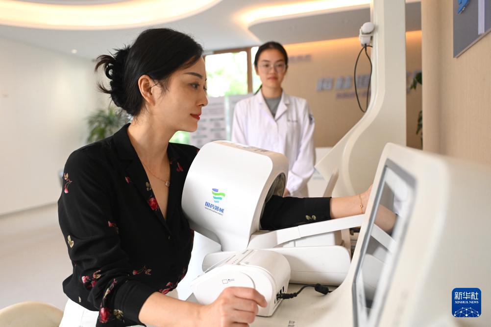 8月4日,一名女士在浙江省杭州市蕭山區(qū)梅林村的智慧健康小站自助測(cè)量血壓。