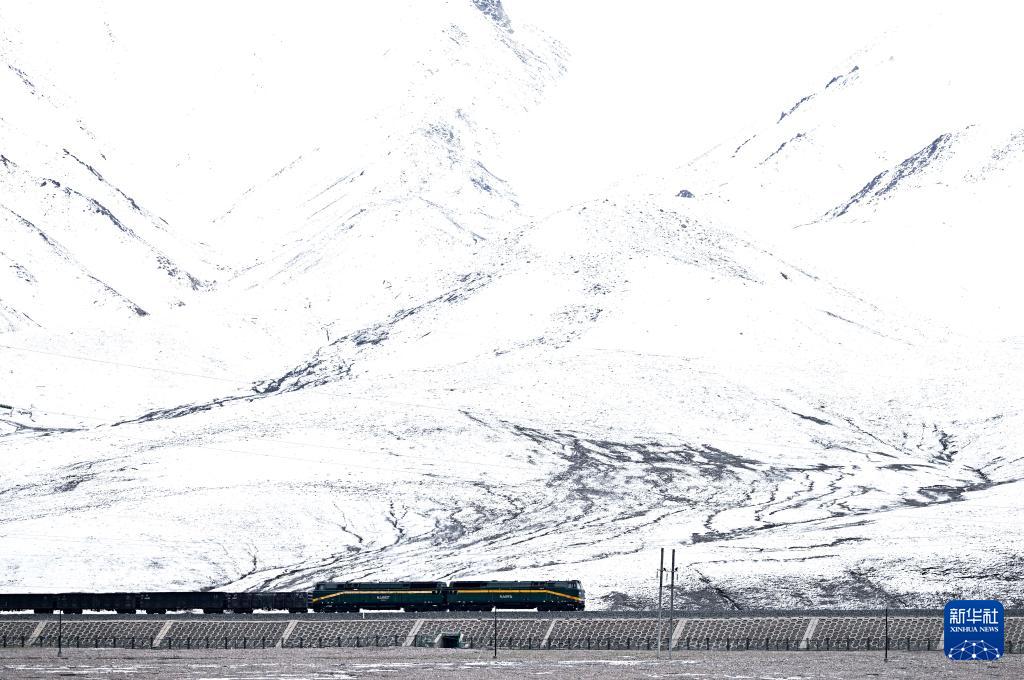 2024年5月27日,列車行駛在昆侖山下的青藏鐵路上。